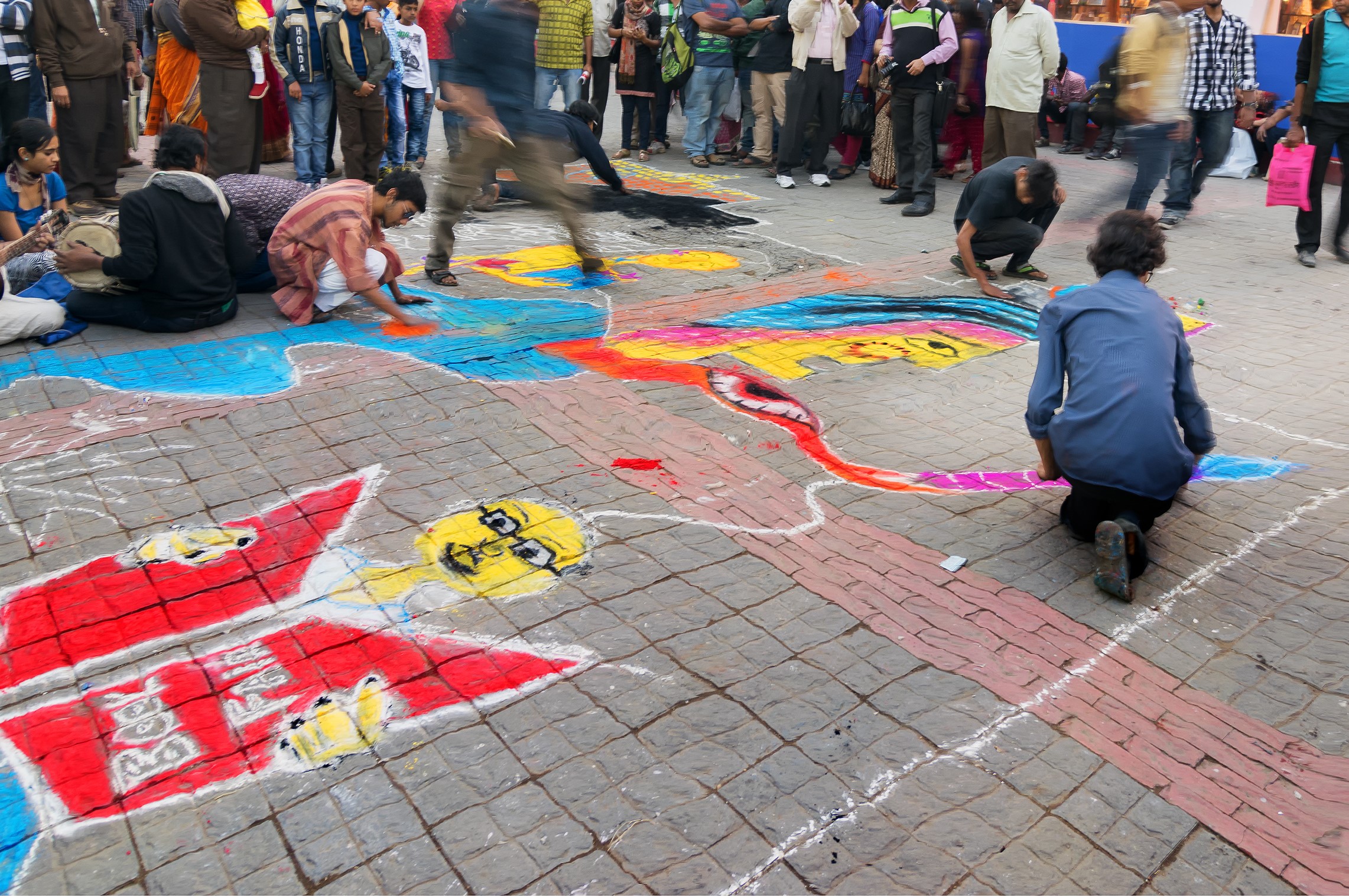 Bildnachweis:IStock, RNMitra (Kolkata, India - February 5, 2015: Young artists painting floor at Kolkata book fair, on February 5th, 2015 in Kolkata. It is world's largest, most attended and famous non-trade book fair.)